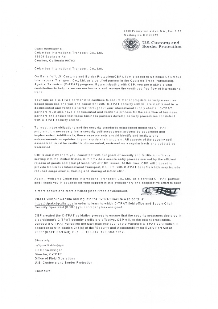2018. 02. 08 C-TPAT 취득 – 미국 세관 및 국경보호국