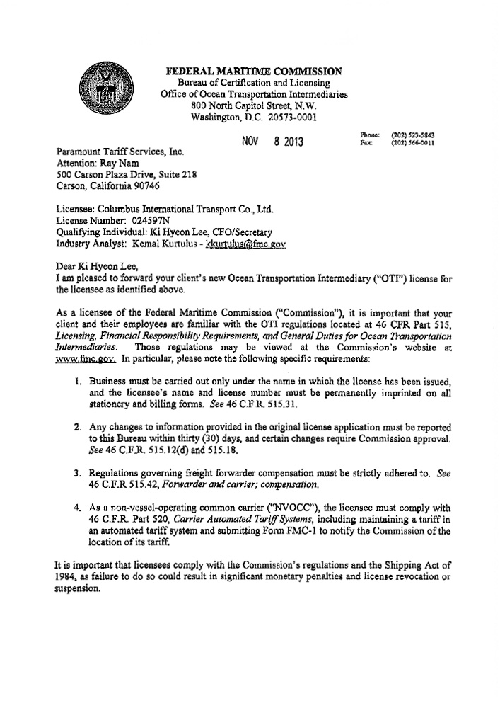 2013. 11. 08 FMC 등록 – 미국 연방해사위원회