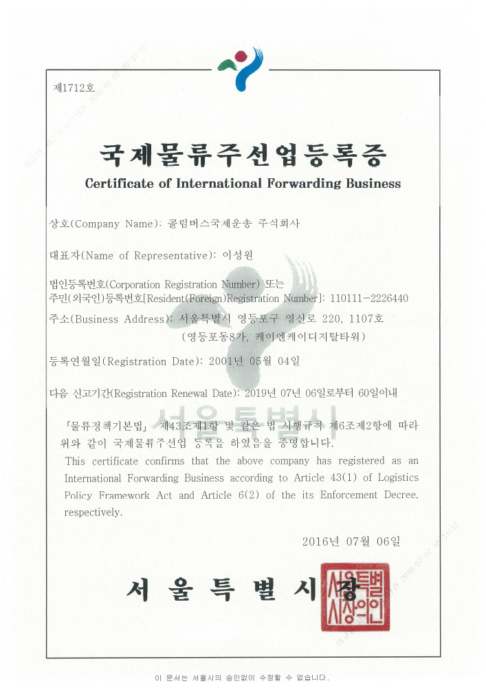 2001. 05. 28 국제물류주선업 면허 취득 (1712호) – 서울특별시